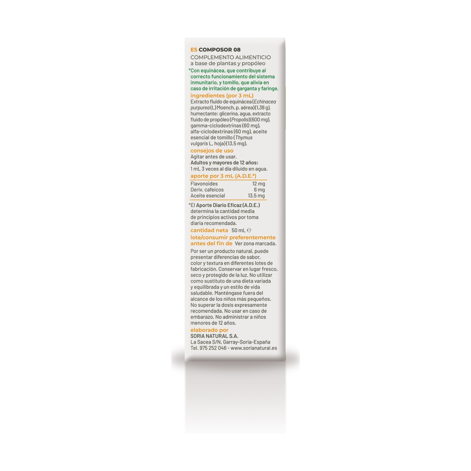 Composor 08 Echina complex de Soria Natural es una combinación de extractos fluidos y liofilizados de plantas medicinales, formulado para potenciar la respuesta inmunitaria del organismo. Combina la acción de la equinácea, el propóleo y el tomillo en una fórmula sin alcohol y de alta biodisponibilidad.