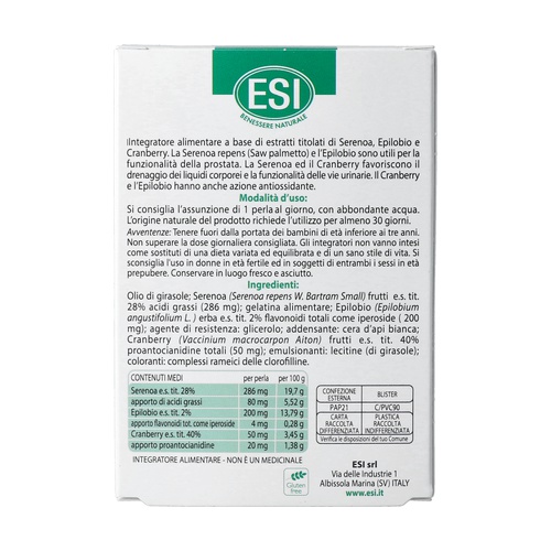 Marca: ESI Trepatdiet | Formato: 30 perlas oleosas | Indicado para: Bienestar prostático y urinario