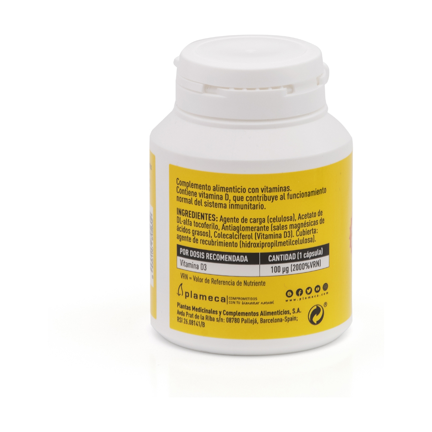 - Vitamina D3 (Colecalciferol): 100 µg (4000 UI). Aporta el 2000% del Valor de Referencia de Nutrientes (VRN).